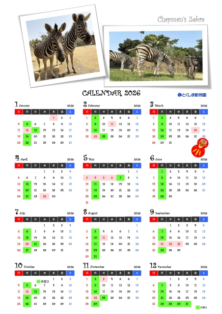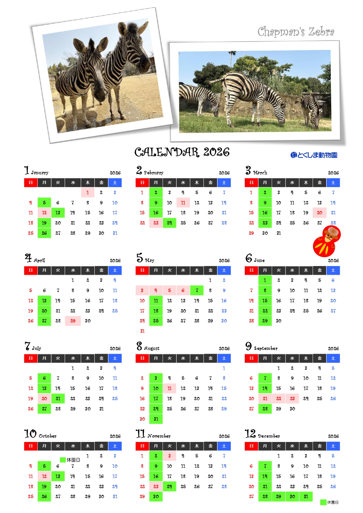 HOME とくしま動物園ご案内 動物園カレンダー(休園日一覧) 動物園カレンダー(休園日一覧) 緑枠が休園日です。注意 月曜が休園日ですが、祝日の場合はその翌日が休園日となります。 気象状況その他により、臨時休園する場合はホームページでお知らせします。 添付ファイル とくしま動物園2026年カレンダー(JPG file 826KB) BACK HOME