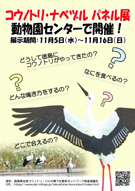 HOME おしらせ コウノトリ・ナベヅルパネル展開催 コウノトリ・ナベヅルパネル展開催 2025/11/04 コウノトリ・ナベヅルパネル展とくしま動物園内 動物園センターにて、「コウノトリ・ナベヅルパネル展」を開催します。コウノトリとナベヅルの知られざる生態や習性を、多くの写真を使って分かりやすく解説しています。このパネル展で、コウノトリ博士・ナベヅル先生になろう!!・開催場所 とくしま動物園内 動物園センター・開催期間 令和7年11月5日(水)から令和7年11月16日(日) BACK HOME